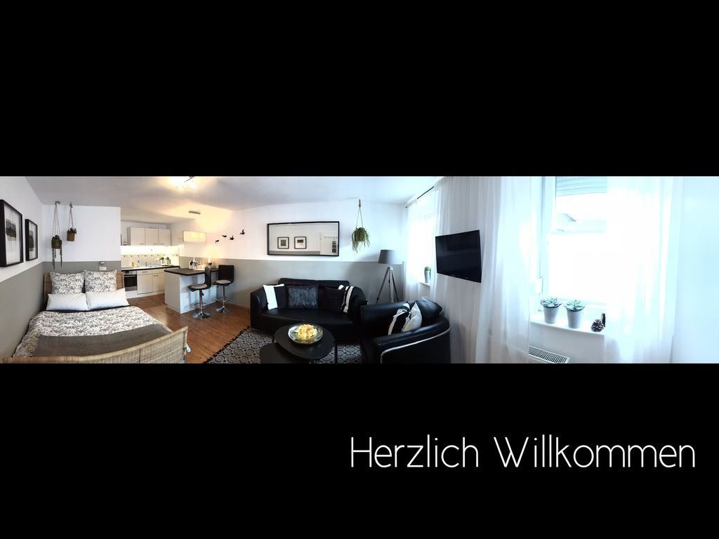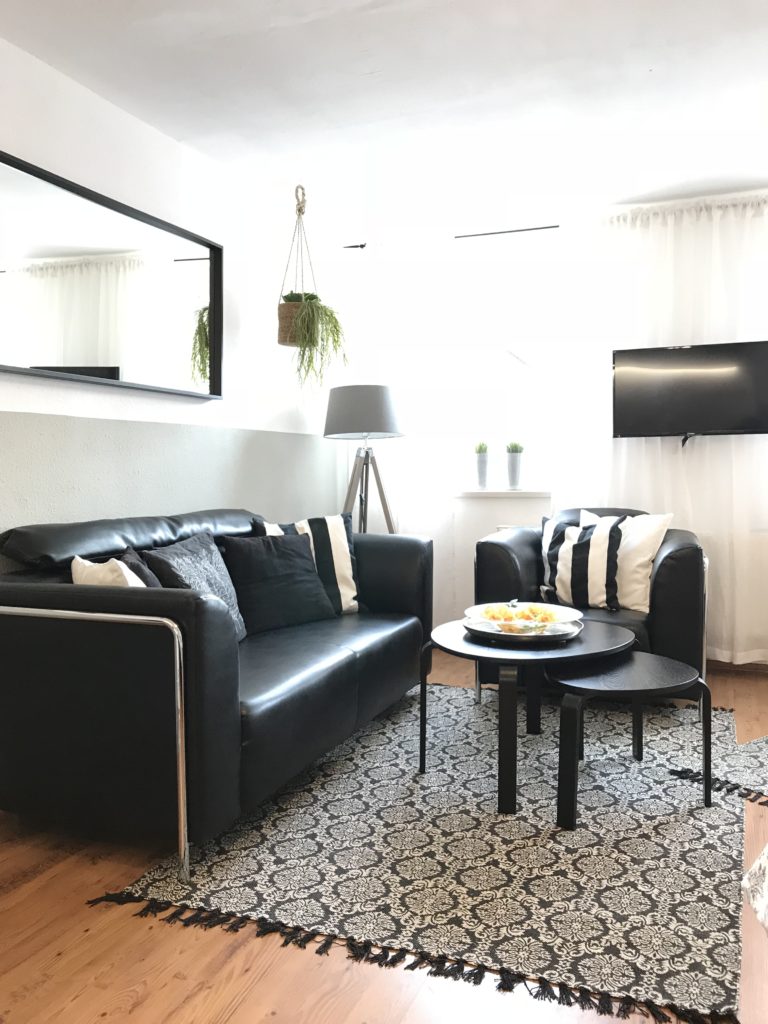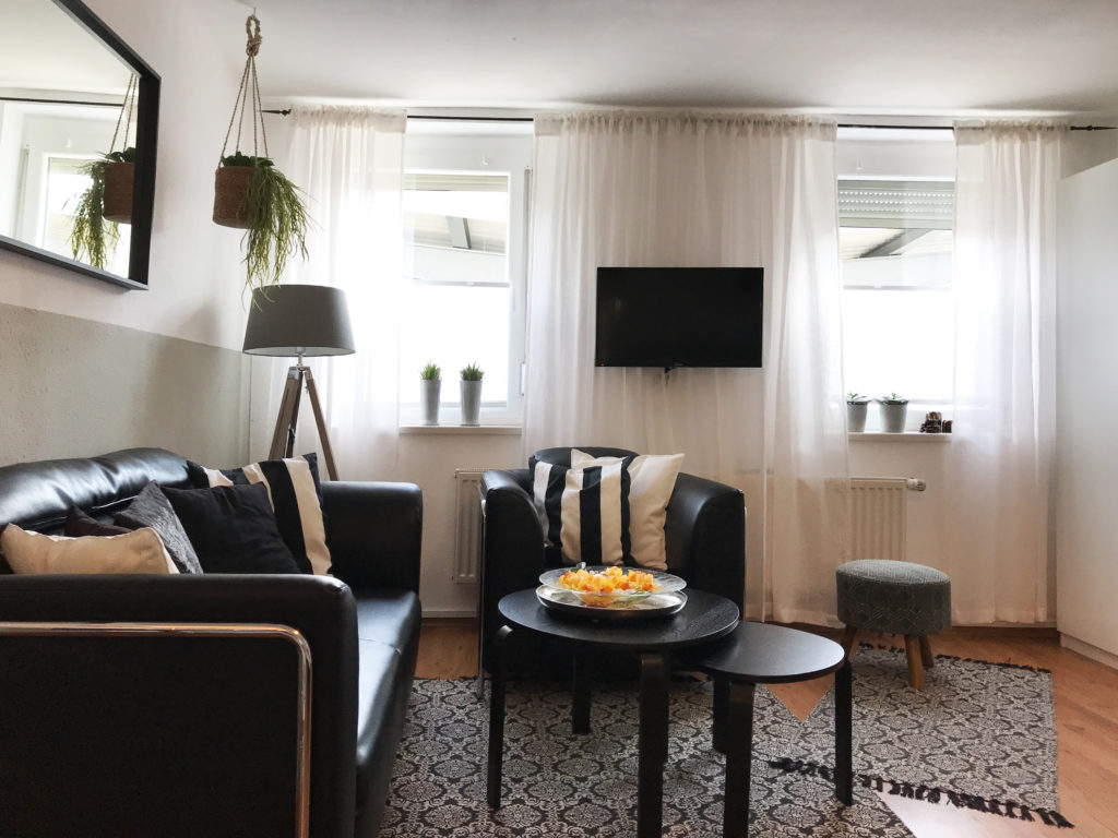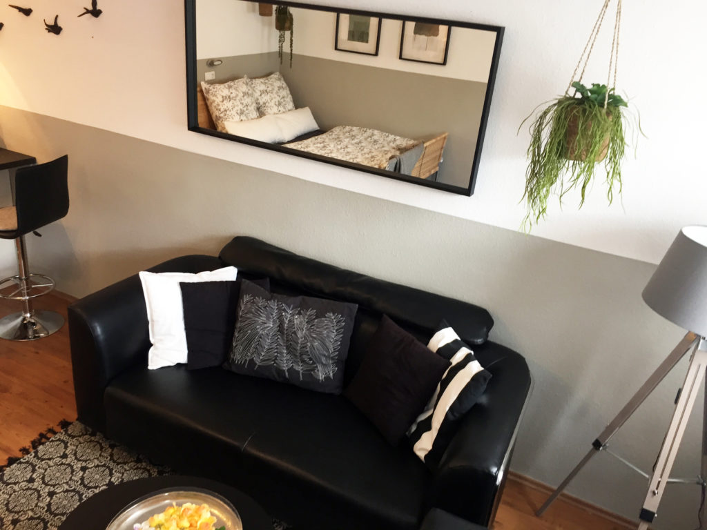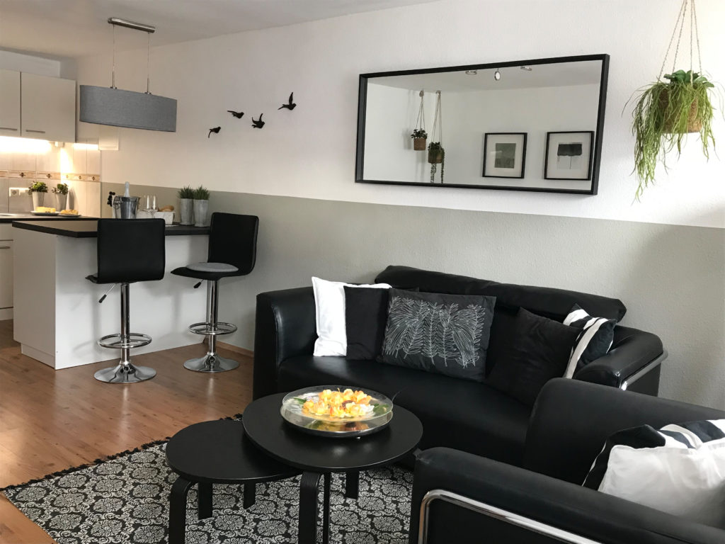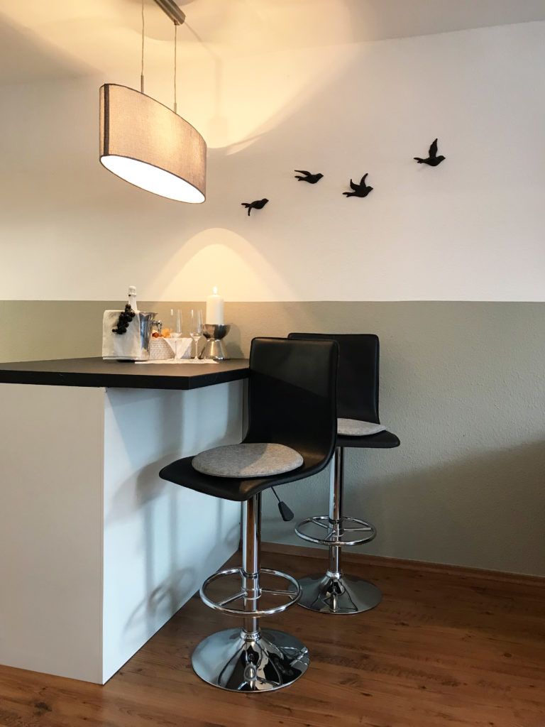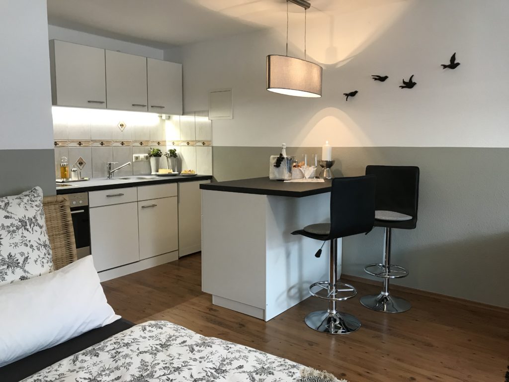 Der geräumige Wohnraum ist liebevoll eingerichtet. Zwei große, mit Insektenschutzgitter ausgestattete Fenster, verleihen dem Wohnraum viel Tageslicht. Die Wohnung verfügt über eine voll ausgestattete Küchenzeile. Kaffeevollautomat, Wasserkocher, Toaster, Töpfe, Spülmaschine ect. stehen zur Selbstversorgung bereit. Eine kleine, nette Kücheninsel inkl. Theke bietet für zwei Personen ausreichend Platz.