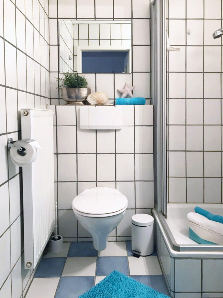 Das Bad ist hell gefliest und mit WC, Waschbereich und Dusche (inkl. Fön ) ausgestattet.